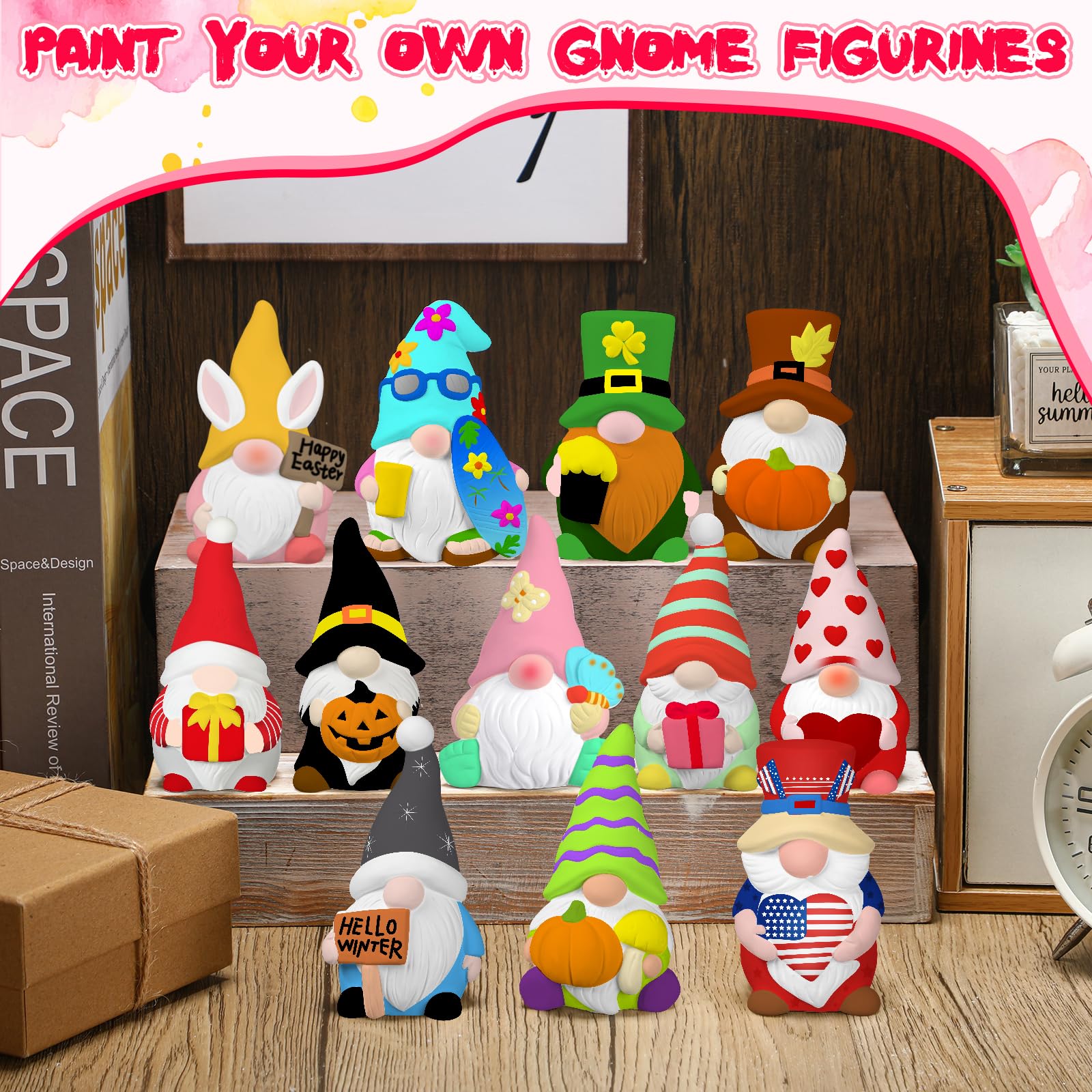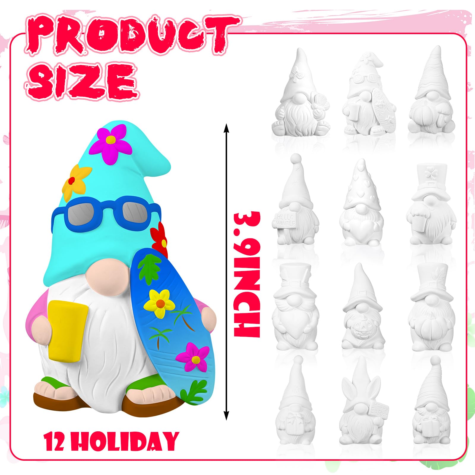 - Impressive Combo Painting Set: your arts and crafts session will be easy with this complete ceramic figurines painting set; You'll receive 12 quality ceramic gnome statues, 24 vibrant paints, 4 brushes, and 2 palettes; Everything you need to bring your gnomes to life is included