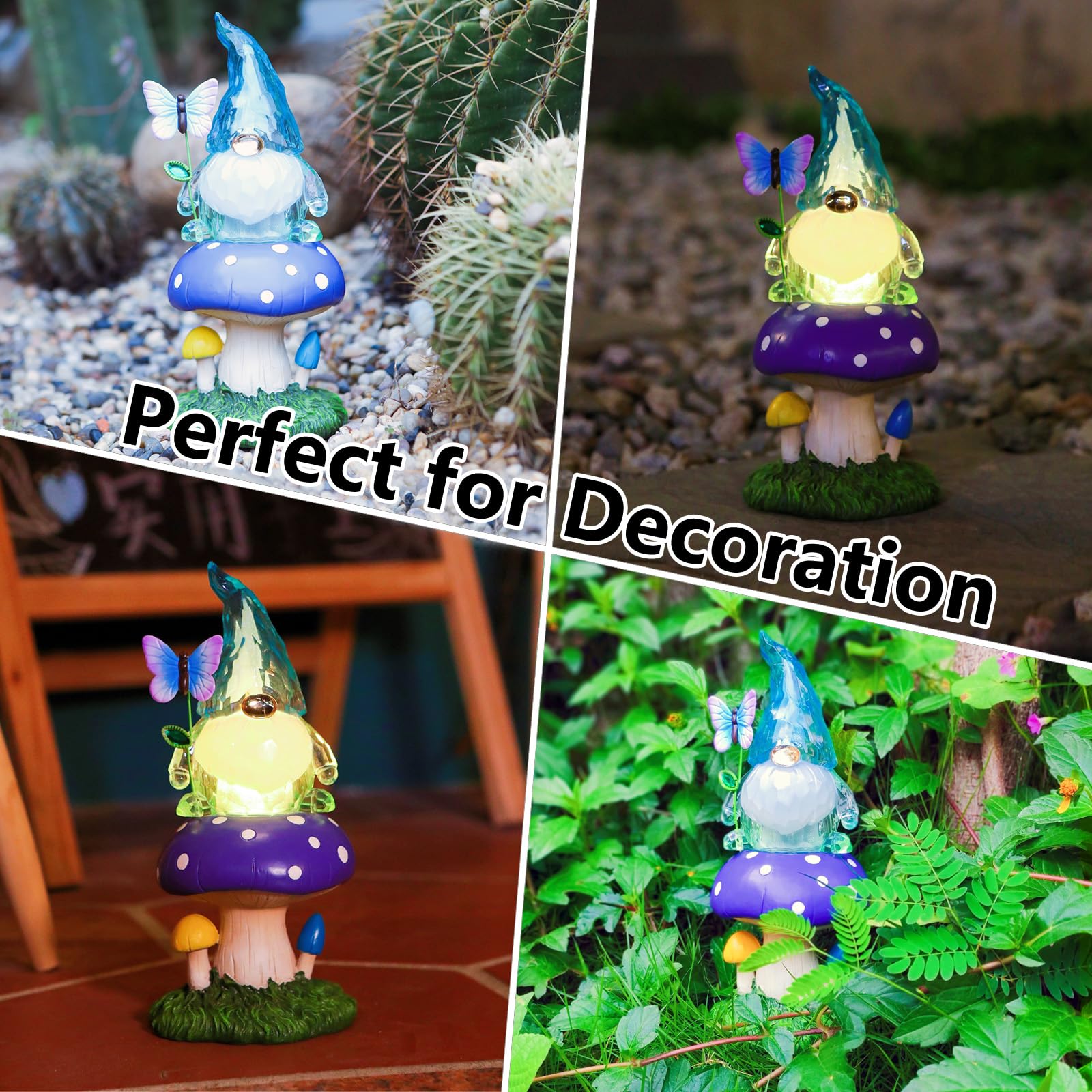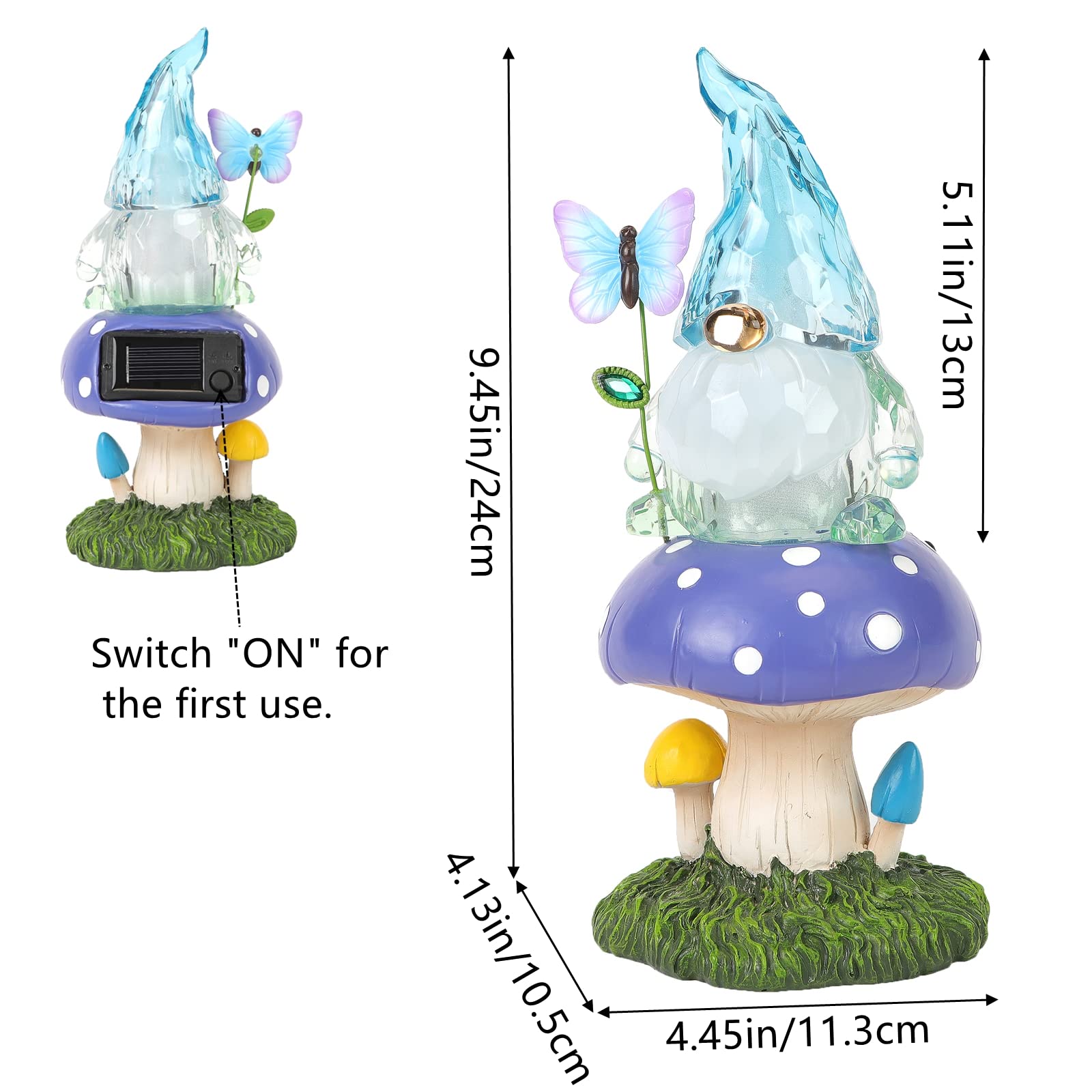 - The part of gnome is made of acrylic, When the night comes, the light automatically turns on and the whole body emits a soft light. The part of mushroom is made of resin, which is lifelike and makes the whole item more stable.