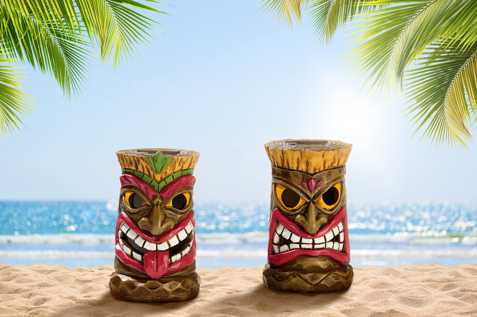 Details: TERESA'S COLLECTIONS Set of 2 Tribal Tiki Head Decor Garden Sculptures & Statues with Solar Lights, Hawaiian Tropical Tiki Torch Totem Figurine, Outdoor Bar Patio Yard Lawn Party Beach Decorations