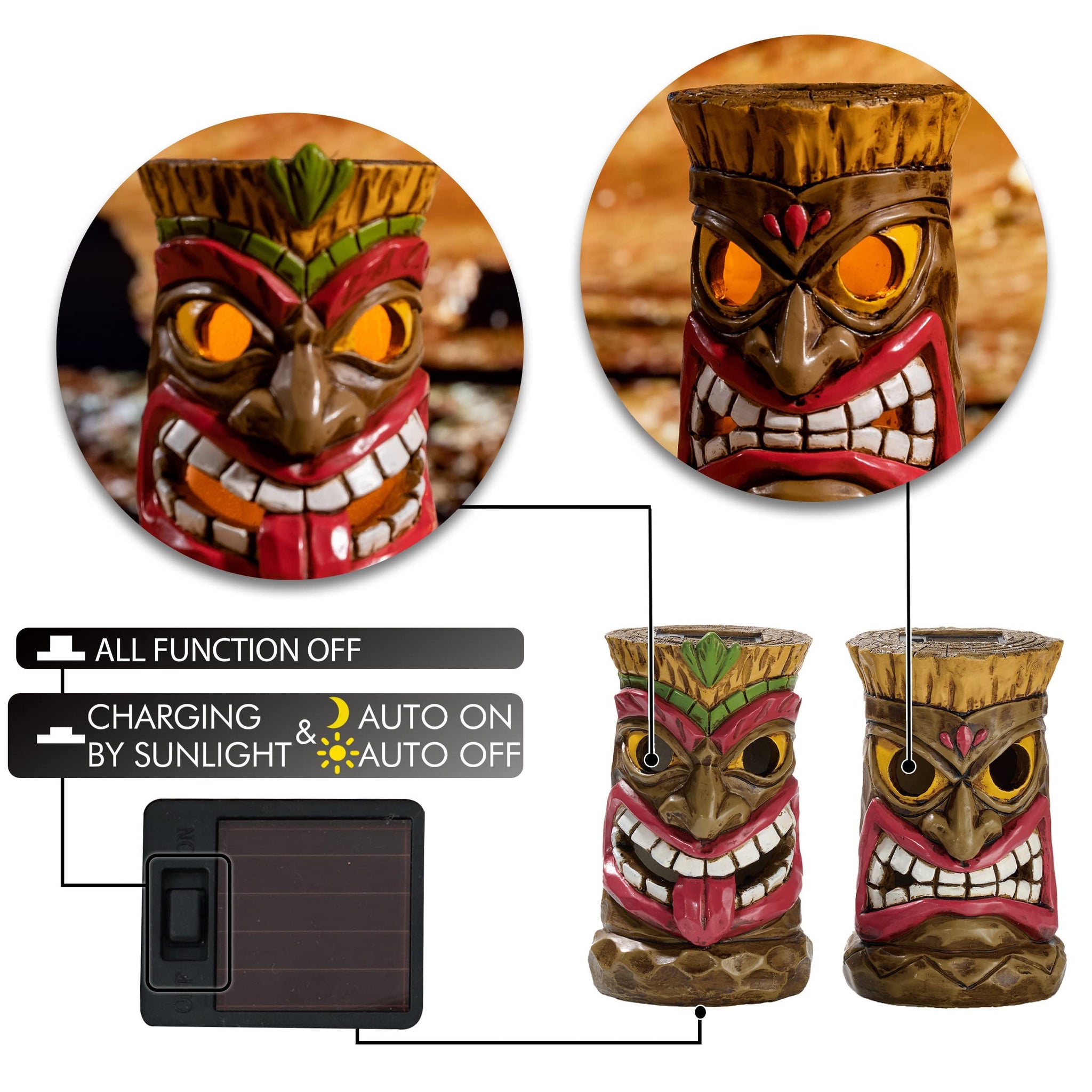 - 【Solar Powered】These Tiki decorations are equipped with advanced solar chips that charge during the day and automatically light up at night for 8 hours. Please turn on the button on the statue before use.