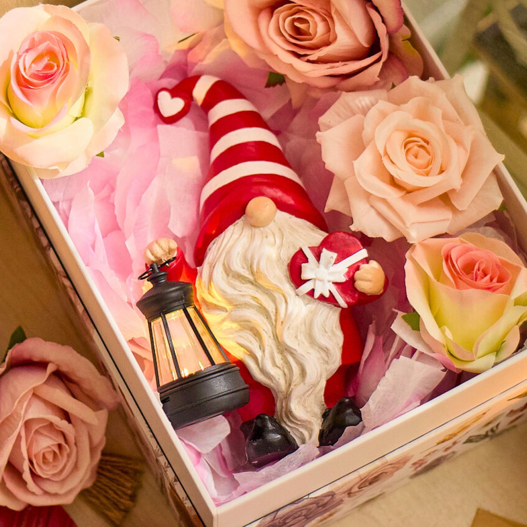 - 【Original Design】TERESA'S COLLECTIONS is a brand of garden decorations that insists on original design. Cute red gonks with solar lantern and heart shaped gift box, would be a delightful love-garden addition.
