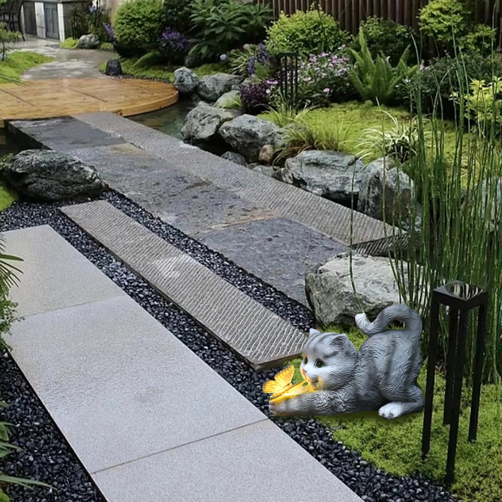 - Excellent Design: Solar Cat Light - The overall shape is retro, the striped surface is mottled and the groove is a conscious technological effect. This cute cat statue is equipped with a luminous butterfly that illuminates the outdoors at night. The butterfly emits a warm light with sunlight or darkens the environment by absorbing sunlight during the day with high quality solar panels.