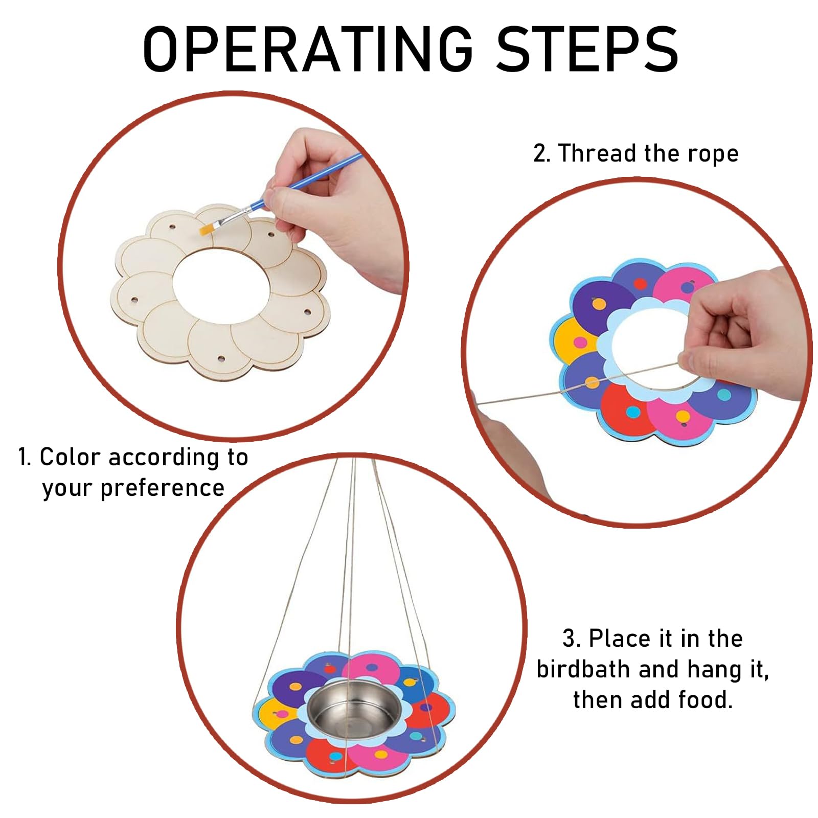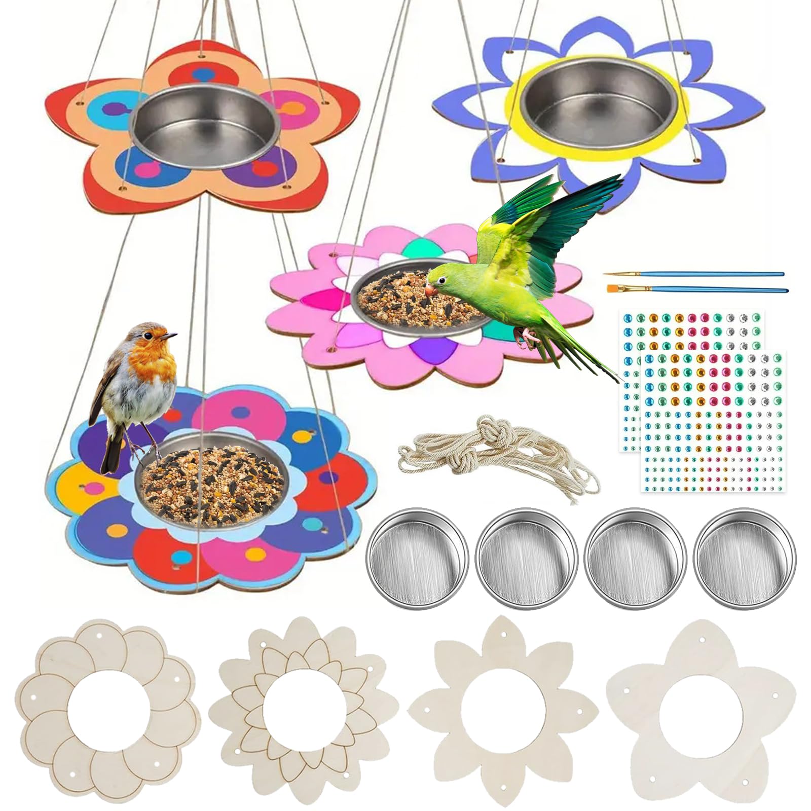 The diy bird feeder is easy to build, they can be made without glue. There are 4 different flower-shaped wooden boards and 4 stainless steel bowls. Put the bowl in the middle of the flower, then pass the jute twine through the holes in the flower. You can decorate it as you want!