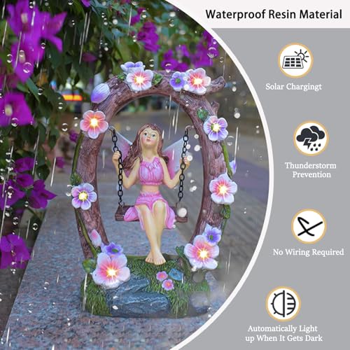 - Cute Solar Fairy Garden Statue: The fairy sits on the swing, and the breeze blows, and the swing will swing, which is very cute. The vine-shaped swing frame is dotted with beautiful flowers, and the stamens are inlaid with 8 LED lights, which emit charming light to light up your garden. This solar fairy statue adds whimsy to your garden.